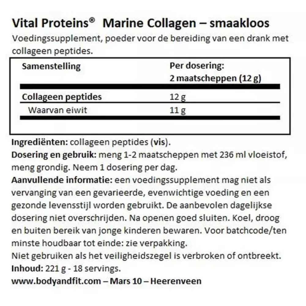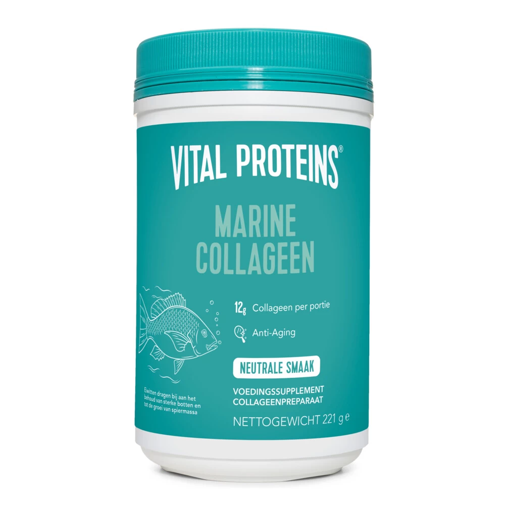 Vital Proteins Marine Collageen Vital Proteins Marine Collageen is een premium eiwit dat gemaakt is van zeedieren. Marine Proteins Collageen – een niet-gearomatiseerd poeder bevat 12 g hoogwaardige witte viscollageenpeptiden per portie.Collageen is een belangrijk structureel eiwit dat prominent aanwezig is in je haar, huid en nagels, maar ook in bindweefsel, pezen, ligamenten en botten.Ondersteunt gezond haar, huid, nagels en gewrichtenBiobeschikbaar: verteerd en snel opgenomen door h