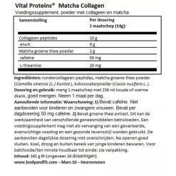 Vital Proteins Matcha CollageenVital Proteins Matcha-collageen is afkomstig van hoogwaardige Japanse matcha groene thee en rundermateriaal. De collageenpeptiden worden verkregen uit de pezen, botten, huiden, bindweefsels en het kraakbeen van runderen en bestaat uit collageen typen 1 en 3 om de hoogste kwaliteit en maximale voedingswaarde te garanderen.Collageen wordt gemakkelijk verteerd en opgenomen door het lichaamRijk aan antioxidanten: Matcha bevat 137 keer zoveel antioxidanten als andere gr