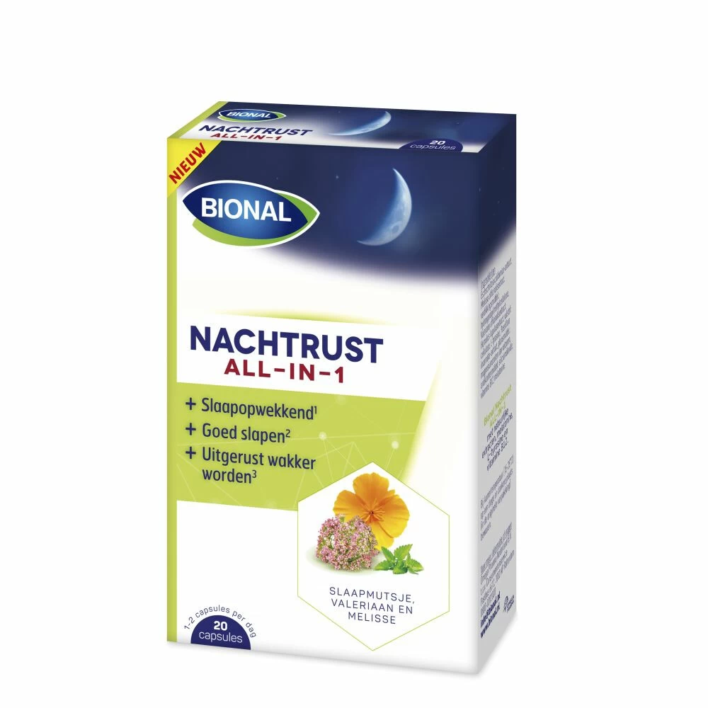 Alles-in-een nachtrusttablettenBional Nachtrust ALL-IN-1 bevat een combinatie van slaapmutsje, valeriaan, hop, melisse en passiebloem. De formule werkt slaapopwekkend, laat u goed slapen en helpt u om uitgerust wakker te worden.Slaapopwekkend (Valeraan*)¹Goed slapen (Passiebloem*)²Uitgerust wakker worden (Melisse*)³*Gezondheidsclaim in afwachting van goedkeuring door de Europese Commissie