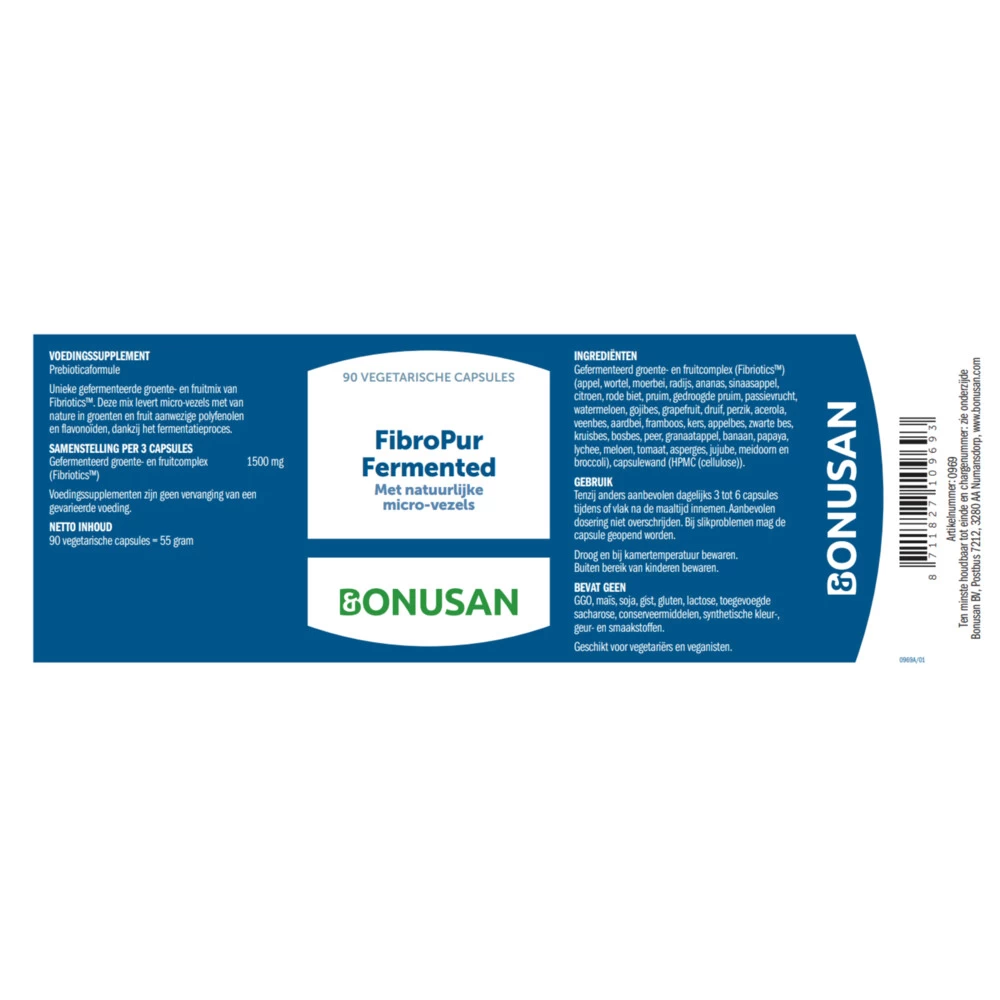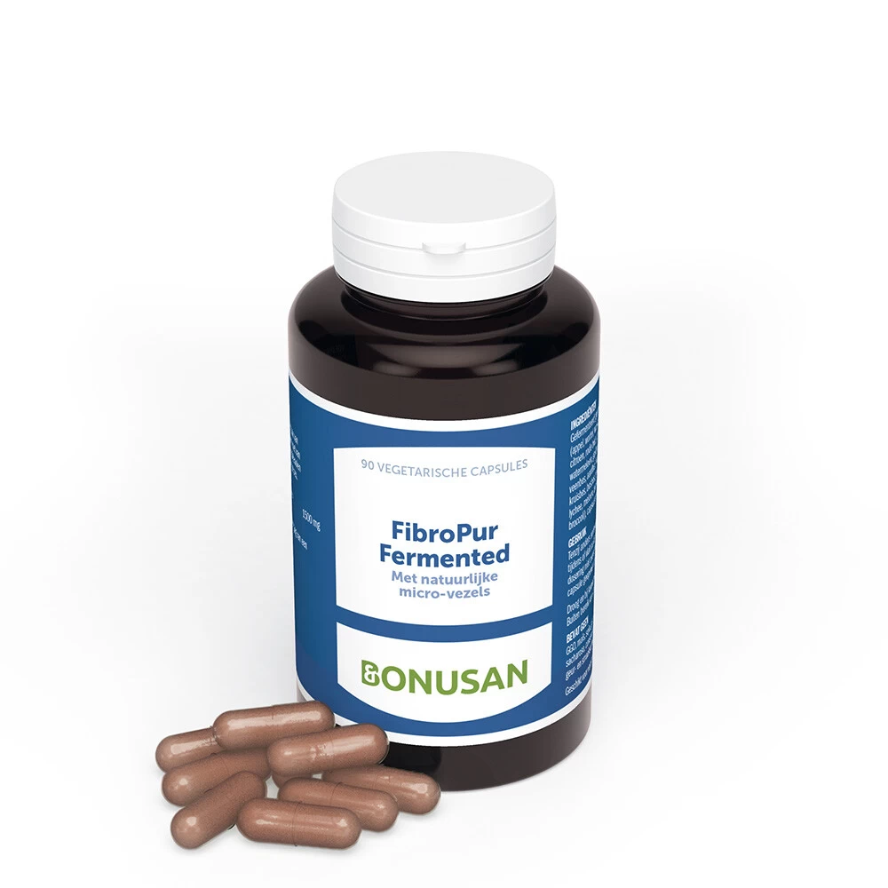 Bonusan FibroPur FermentedBonusan FibroPur biedt de grootste variëteit aan vezels met voorgefermenteerde vezels uit 36 soorten groenten en fruit. Dit is een ongekende hoeveelheid. FibroPur Fermented bevat alle belangrijke metabolieten en meer dan 90% microvezels, die makkelijker te fermenteren zijn dan andere vezels. Normaal vindt fermentatie van fermenteerbare vezels volledig in de dikke darm plaats, maar bij Bonusan FibroPur Fermented hoeft dat niet meer, de vezels zijn namelijk al voor g