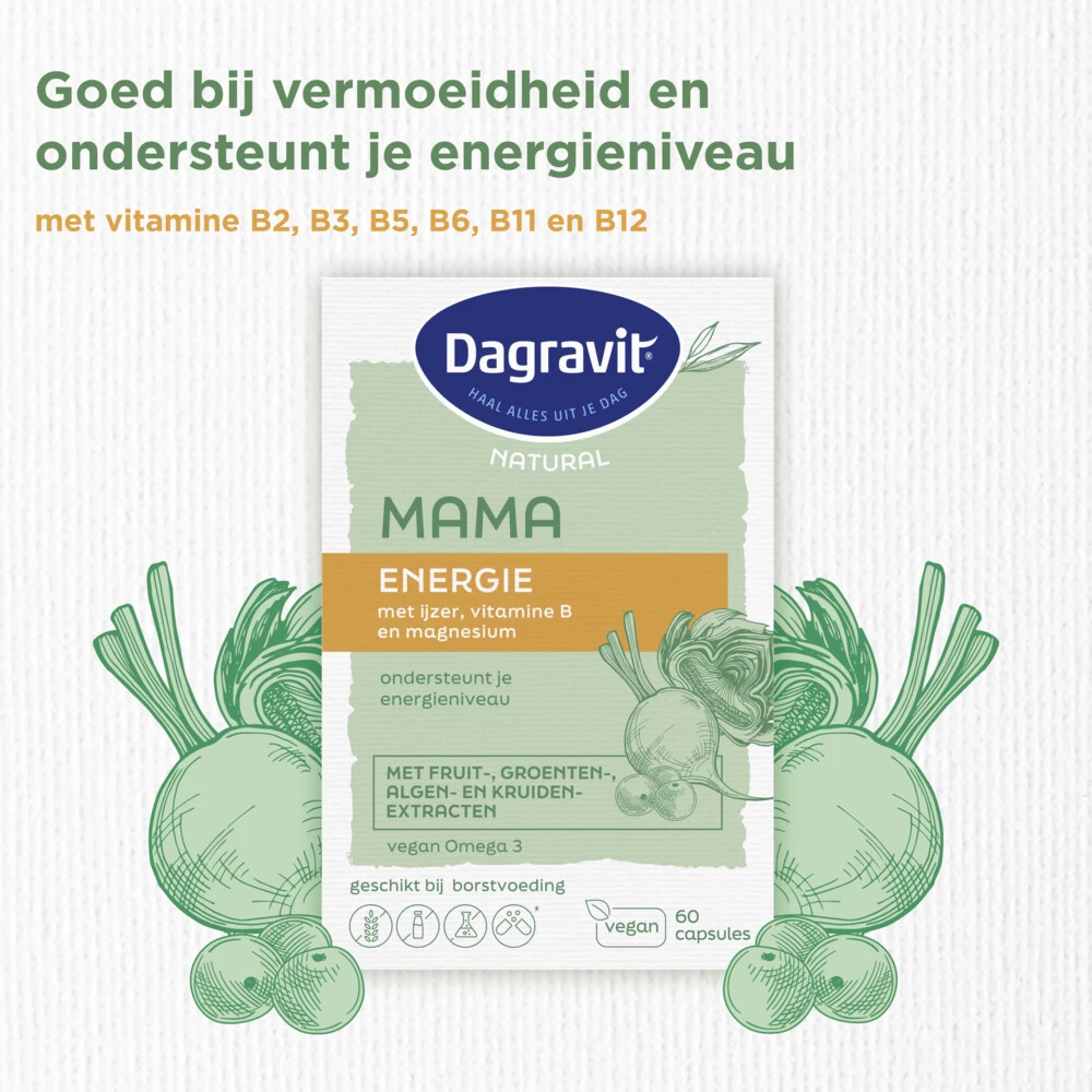 Dagravit Natural Mama EnergieDagravit Mama Energie is een voedingssupplement met een unieke mix van essentiële vitaminen en mineralen, speciaal afgestemd op moeders, met o.a. extra ijzer, vitamine D3 en een bron van vegan omega 3, gecombineerd met een speciale mix van fruit-, groenten-, algen en kruidenextracten.Ondersteunt je energieniveau, ook al je borstvoeding geeft*Goed bij vermoeidheid en helpt je opnieuw fit te voelen**Voor het behoud van een gezonde huid en glanzend haar***Geschikt