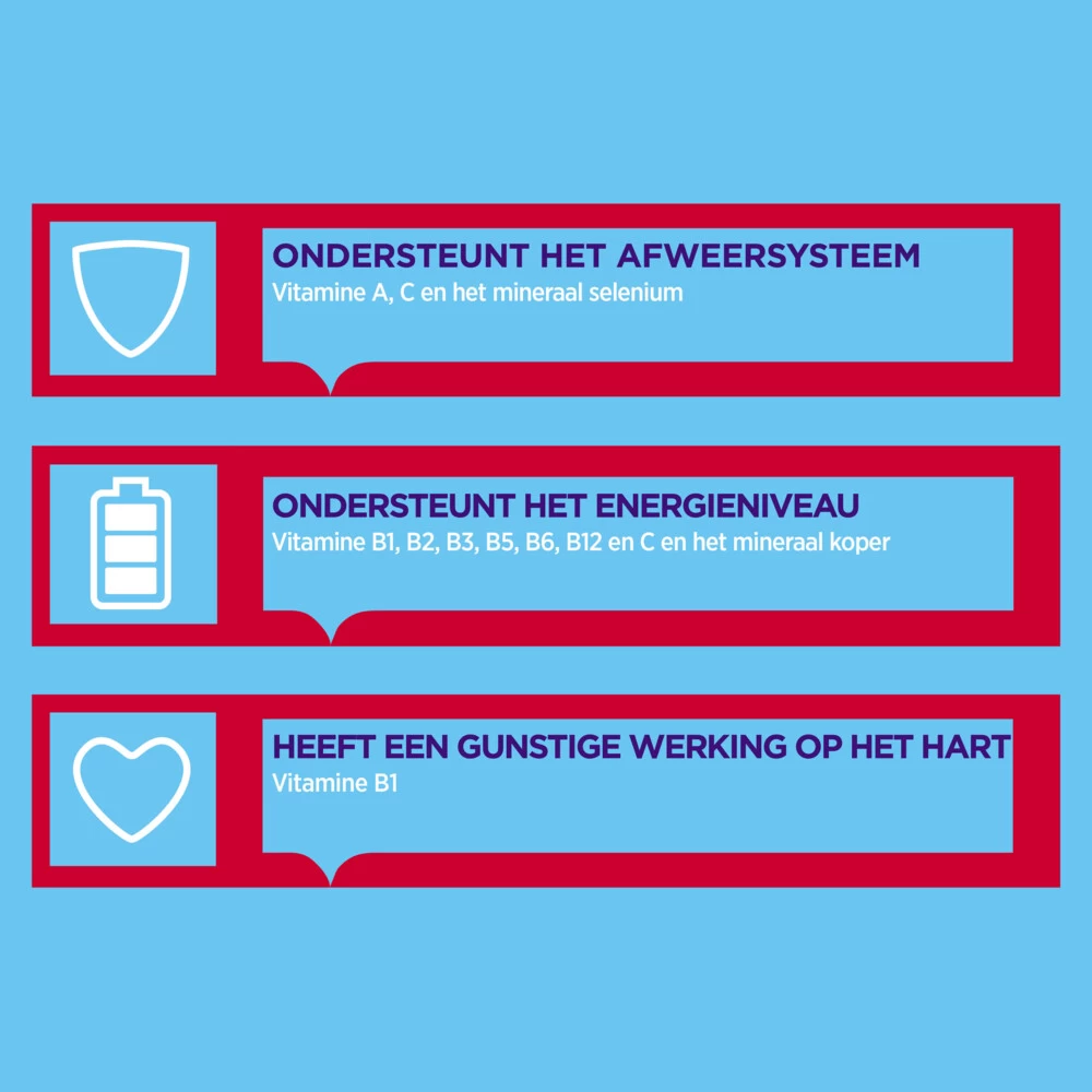 Dagravit Totaal 30Dagravit Totaal 30 bevat 30 belangrijke vitaminen, mineralen, plantenextracten en nutriënten als aanvulling op je dagelijkse voeding. Het ondersteunt de afweer* van het lichaam en is goed voor je energiehuishouding** en je hart***.Ondersteunt het immuunsysteem*Goed voor de energiehuishouding**Gunstige werking voor het hart***Bevat geen conserveermiddelen, geur- en smaakstoffen en is lactosevrij*Vitamine A, C en het mineraal selenium ondersteunen de afweer van het lichaam.*