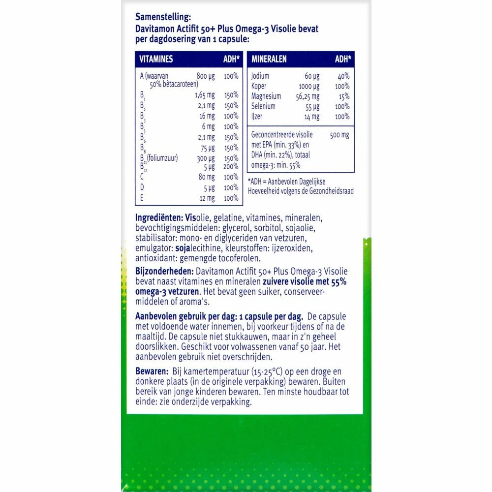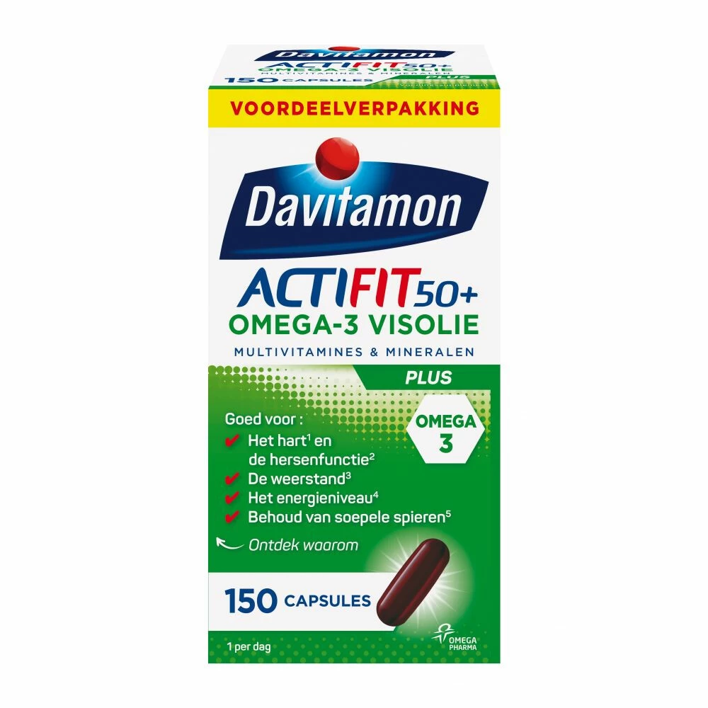 Davitamom formule die het hart ondersteunt Speciaal voor volwassenen vanaf 50 jaar combineert Davitamone Actifit 50 Plus Omega-3 Visollie de vitamines, mineralen en zuivere visolie met 55% omega-3 vetzuren in een capsule per dag. Deze formule is goed voor het hart, hersenen, de weerstand, het energieniveau en het behoud van sterke botten. De toegevoegde visolie bevat namelijk de unieke omega-3 vetzuren EPA en DHA die, bij dagelijkse inname van 250 mg EPA en DHA, bijdragen aan het goed blijv