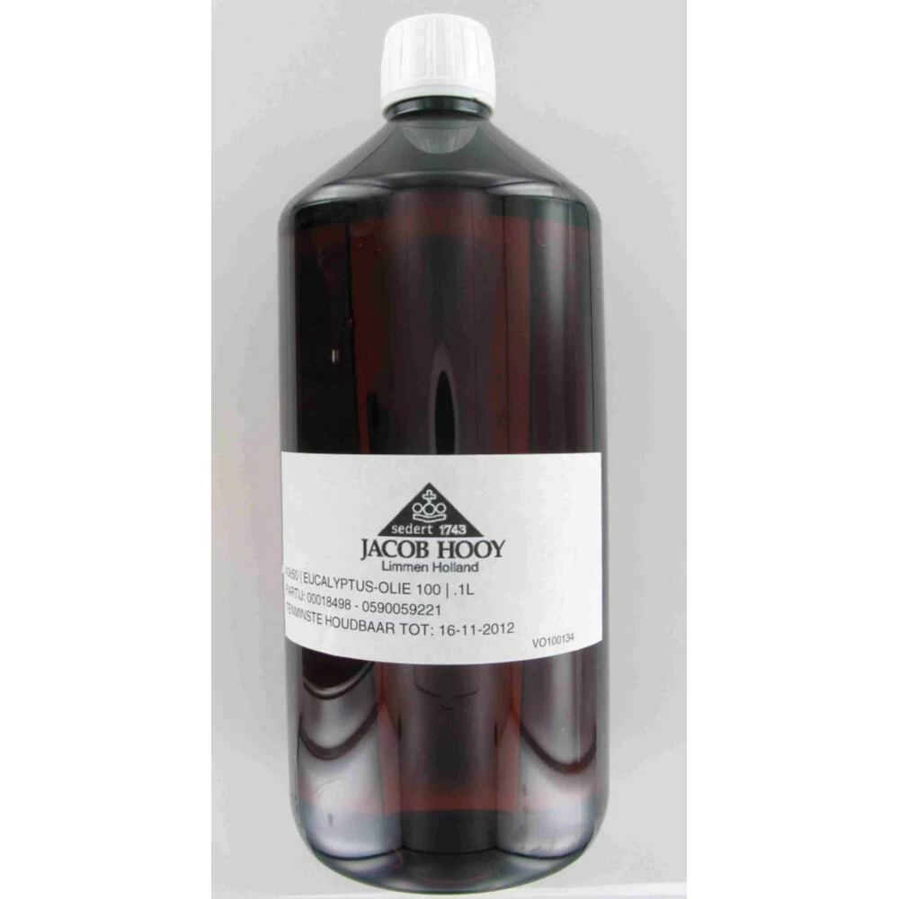 Jacob Hooy Eucalyptus OlieJacob Hooy Essentiële Olie Eucalyptus heeft een frisse en licht scherpe geur. Werkt goed in combinatie met anijs, bergamot, ceder, citroen, lemongrass, niaouli, pepermunt en rozemarijn. De geuren van etherische oliën hebben invloed op de geestelijke veerkracht en brengen een prettige sfeer in huis.Essentiële olieVoor een prettige sfeer in huisVoor uitwendig gebruikNiet onverdund gebruikenGrote verpakking van 1000 ml
