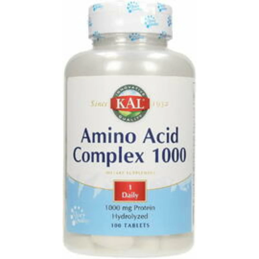KAL Aminozuren Complex 1000mg met 18 AminozurenKal Aminozuren Complex 1000 is een aminozuurmengsel dat 18 van de belangrijkste aminozuren in 1000 mg verteerde eiwitten per tablet bevat. Deze tabletten zijn geschikt voor vegetariërs en zijn vrij van tarwe en gluten. Aminozuren Complex is afkomstig van gehydrolyseerde caseïne, dit ‘voorverteerde’ eiwit kan gemakkelijk door het lichaam worden opgenomen.