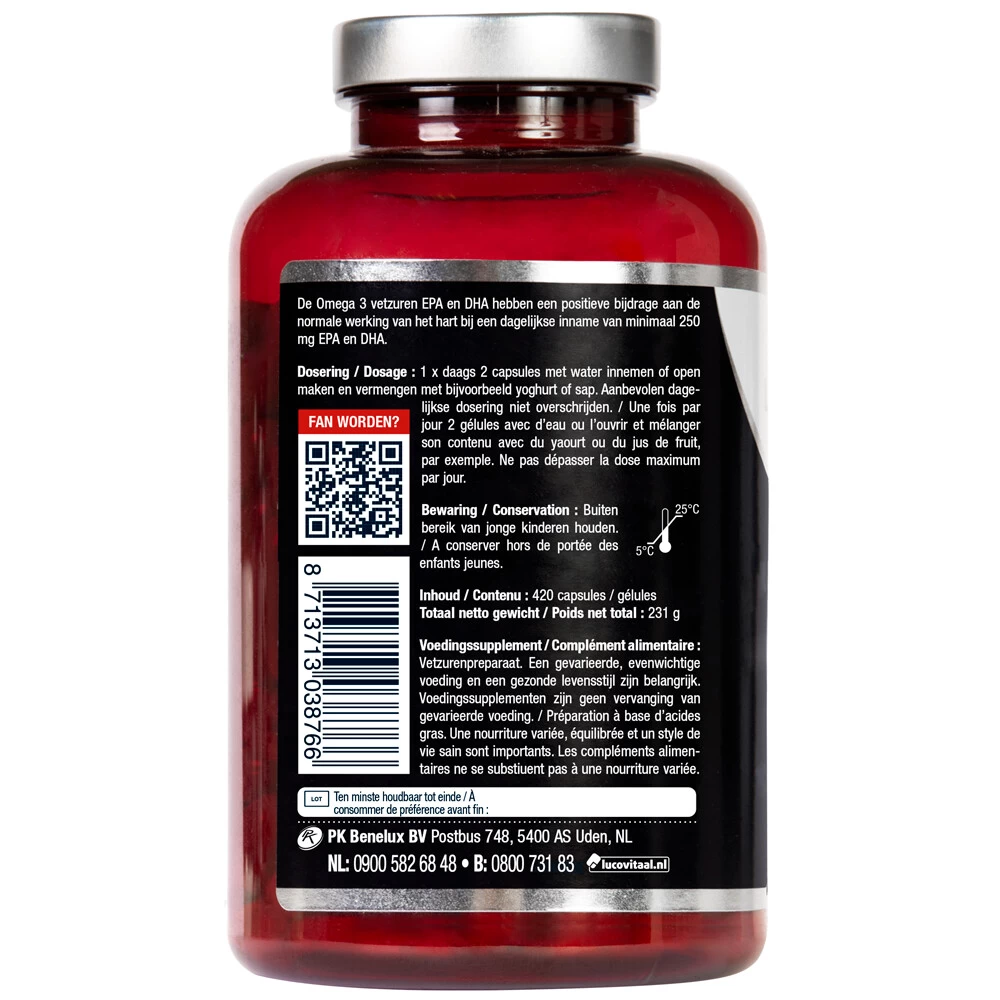 Lucovitaal Omega 3-6-9 Omega 3-6-9 van Lucovitaal bevat de juiste samenstelling onverzadigde vetzuren in de juiste verhoudingen. De meervoudig onverzadigde vetzuren van Omega 3-6-9 zijn vetzuren in droge vorm. Dit heeft als voordeel dat deze puur en zuiver zijn, zoals het van oorsprong bedoeld is.De omega 3 vetzuren EPA en DHA hebben een positieve bijdrage aan de normale werking van het hart, *bij een dagelijkse inname van 250 mg EPA en DHA.Daarnaast is DHA, bij een dagelijkse inname van 25