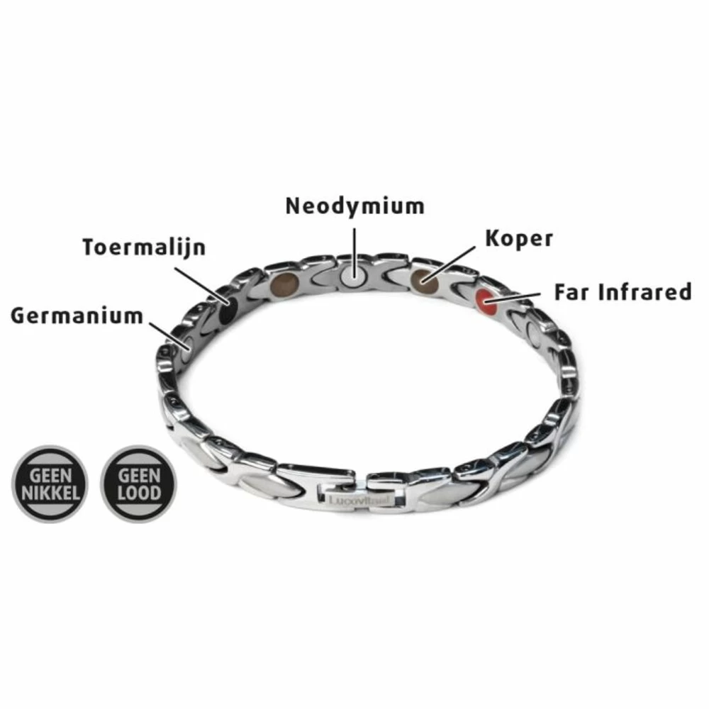 Lucovitaal Magneet Armband ZilverLucovitaal Yinmagnetic Magneet Armband Zilver is te dragen door zowel mannen als vrouwen. De armband is makkelijk in tekorten dus geschikt voor elke pols. De magneet armband is gemaakt van duurzaam gepolijst metaal, een metaal legering met corrosie bestendigheid van de allerbeste kwaliteit met 5 elementen als neodymium, germanium, far infrared, toermalijn en koper met maar liefst 3000 Gauss.Zowel voor mannen als vrouwenGemaakt van duurzaam gepolijst edelmetaalOxi