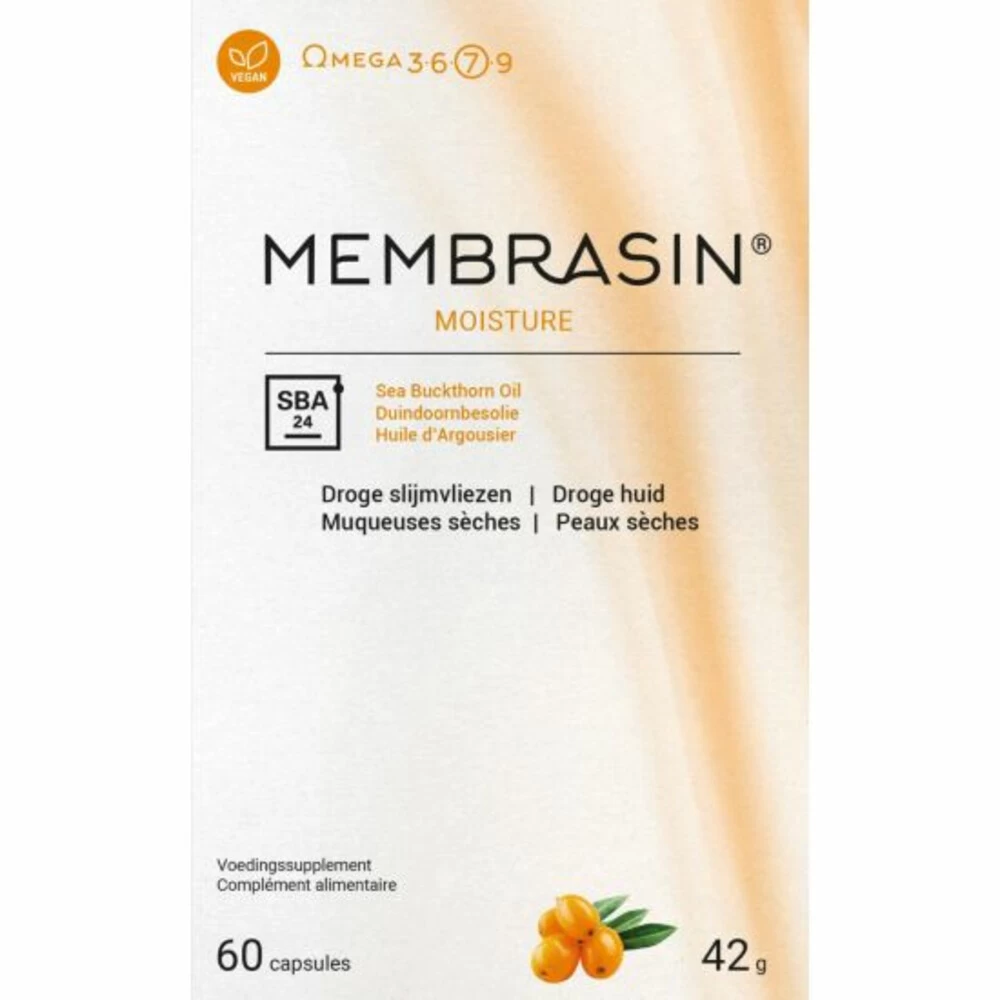 Membrasin Omega 7Membrasin Omega 7 helpt bij droge ogen, droge huid en droge slijmvliezen. Membrasin Omega 7 bevat de pure Duindoornbesolie uit het vruchtvlees en de pit van de duindoornbes. De duindoornbes helpt bij droge ogen, droge mond en droge slijmvliezen en helpt de gezonde huid van binnenuit. Membrasin Duindoornbesolie zit boordevol vitamines en omega vetzuren die de huid van binnenuit voeden en het collageen in stand houden. Hoe meer collageen, hoe steviger en elastischer de huid..Membr