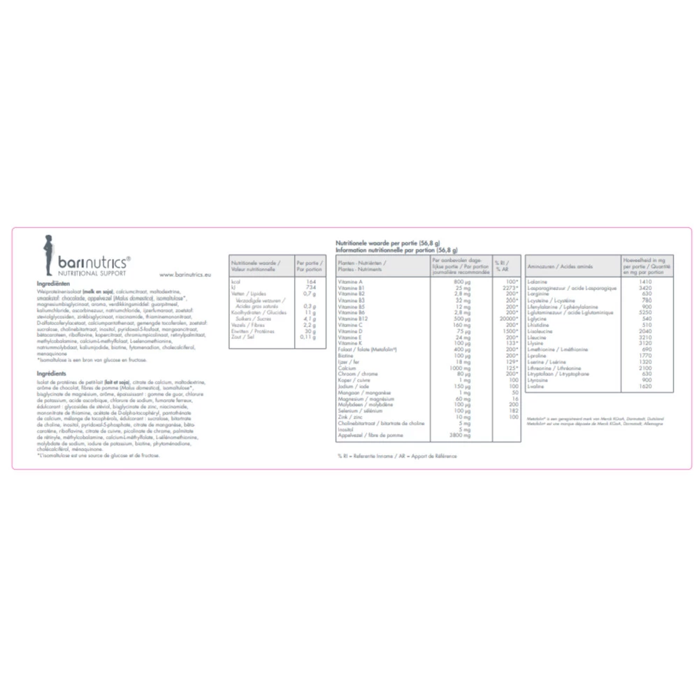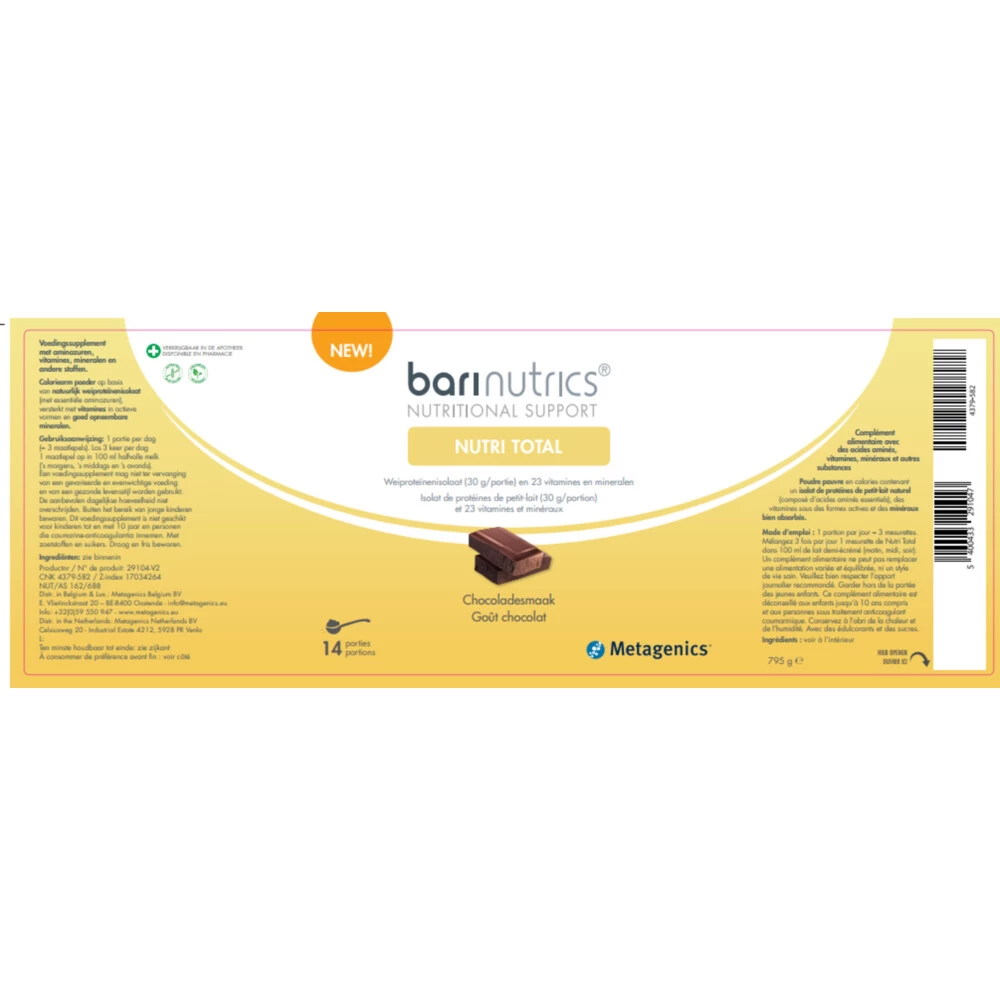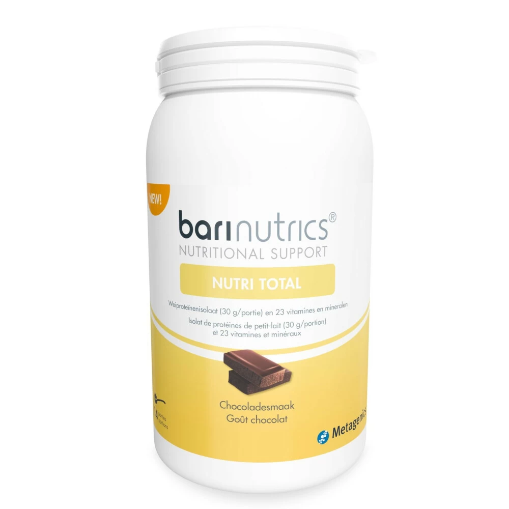 Barinutrics NutriTotal vóór en na een bariatrische ingreepBarinutrics is voedingssupplementen met chocoladesmaak dat is afgestemd op de nutritionele behoeften vóór en na een bariatrische ingreep. Een bariatrische ingreep is een maagverkleining. De specifieke formules garanderen dat je dagelijks alle noodzakelijke vitamines en mineralen inneemt én opneemt. BariNutrics NutriTotal bevat wei-eiwitisolaat en 23 essentiële vitamines en mineralen.Vóó