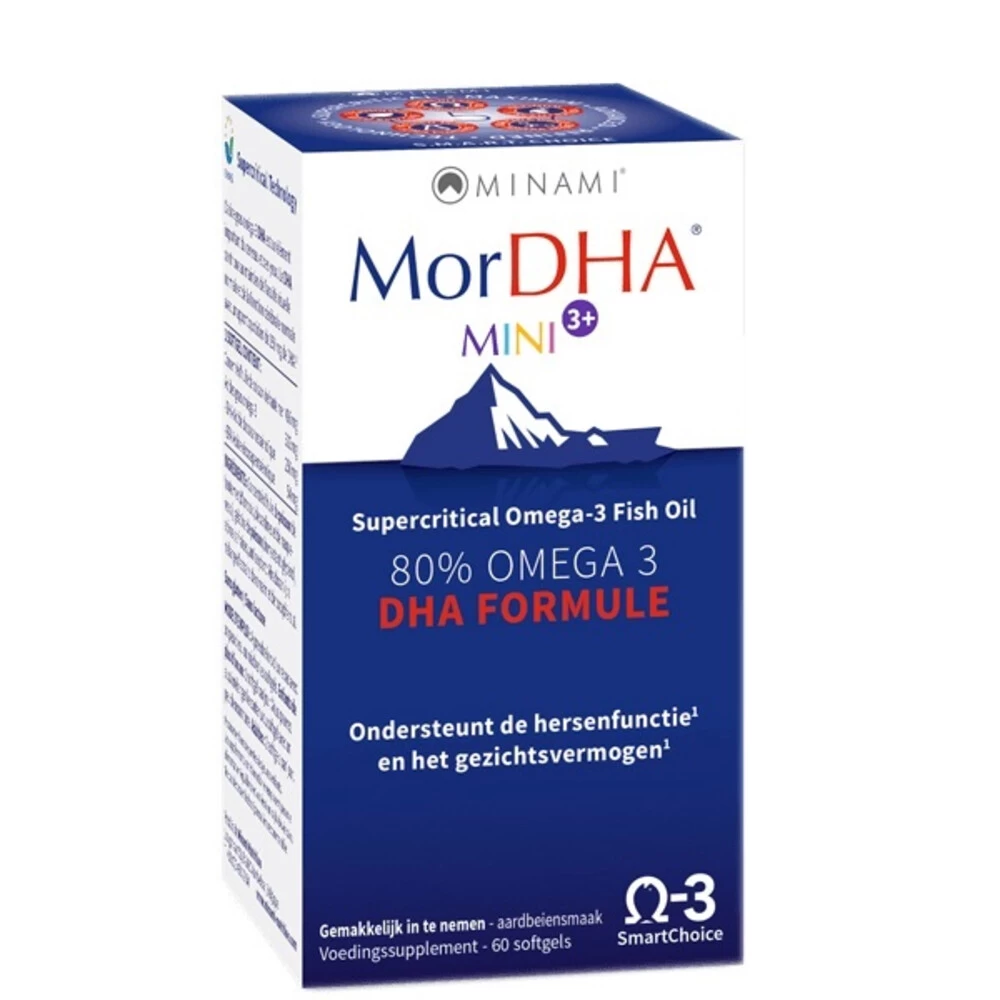 Minami Mor Dha Mini IqMinami MorDHA Kids in kleine softgel met aardbeiensmaak, is speciaal ontwikkeld voor kinderen vanaf 3 jaar. DHA is een belangrijke bouwsteen voor de hersenen en speelt een rol in het goed functioneren van de hersenen. Daarnaast ondersteunt DHA bij een dagelijkse inname van 250 mg, de conditie van het oog en is goed voor het gezichtsvermogen.DHA ondersteunt de hersenfunctieSoftgel met aardbeiensmaakVoor kinderen vanaf 3 jaar