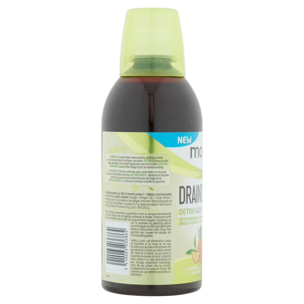 Modifast Draineur met Ananassmaak 500 mlEliminatie: Groene thee, moerasspirea, witte dovenetel en cichorei bevorderen de afvoer van water. Detox: Cichorei en Klis vergemakkelijken het ontgiftingsproces van het lichaam. Vetverbranding: Groene thee draagt bij tot de vetverbranding.Detox klis en cichorei Vetverbanding groene thee 0% suiker 10 kuur/dagenHet is belangrijk evenwichtig en gevarieerd te eten en een gezonde levensstijl na te leven. Vergeet niet om dagelijks voldoende te drinken.
