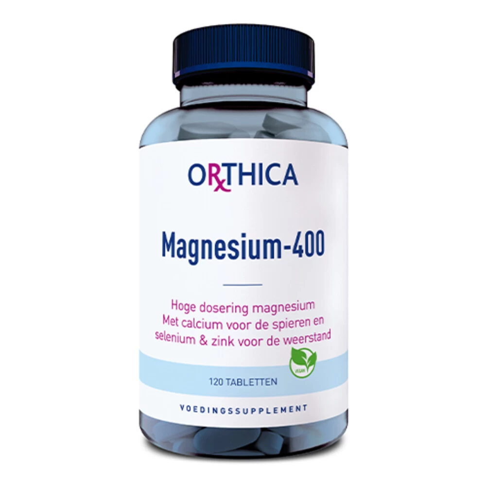 Goed voor spieren en zenuwstelsel1Orthica Magnesium-400 is een mineralenpreparaat dat een hoge dosering magnesium bevat. Naast magnesium is er ook selenium, calcium en zink toegevoegd. Deze combinatieformule is ter ondersteuning van je botten2, spieren1, zenuwstelsel1 en je weerstand3. Goed opneembaar voor iedereen met een goede spijsvertering. Magnesium-400 kan met name een goede aanvulling zijn voor mensen die intensief sporten of vrouwen die zwanger zijn. Bevat 400 mg magnesiumGoed voor