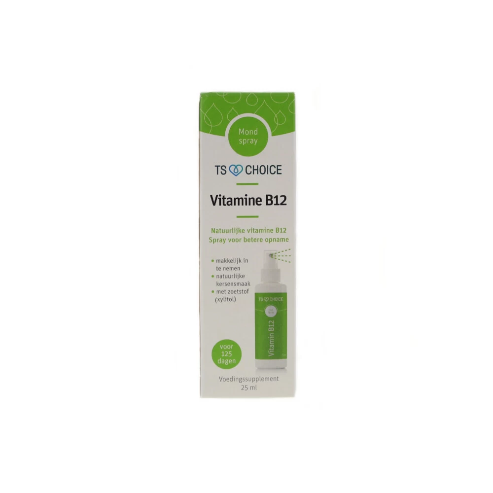 TS Choice Vitamine B12 SprayVitamine B12 Spray van TS Choice bevat vitamine B12 in haar natuurlijke vorm namelijk methylcobalamine. TS Choice Vitamine B12 Spray is ideaal voor mensen die moeite hebben met het slikken van tabletten en een vegetarisch of veganistisch dieet volgen. Naast het gemak zorgt de sprayvorm ook voor een betere opname. Het hoeft niet via het maagdarmstelsel, maar gaat direct via het mondslijmvlies. Met één spray in de mond krijg je de juiste hoeveelheid