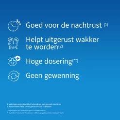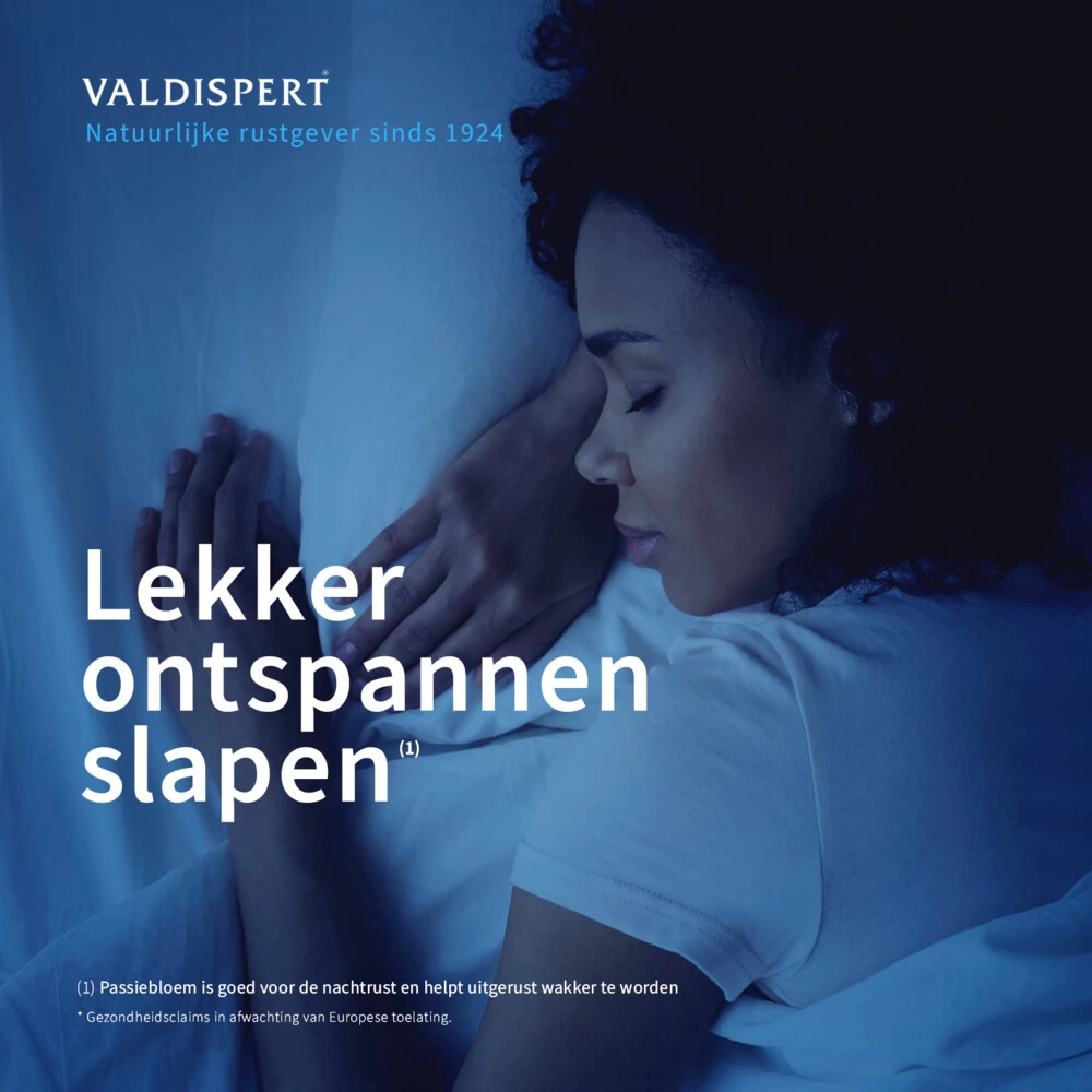 Valdispert Nacht SterkValdispert Sterk is een voedingssupplement met valeriaanwortelextract, passiebloem en melatonine. Passiebloemextract ondersteunt het natuurlijke slaapproces door zijn rustgevende invloed. Melatonine is een lichaamseigen stof die in onze pijnappelklier wordt aangemaakt. Valeriaan geeft een ontspannen en rustig gevoel en bevordert een natuurlijke slaap*.Goed voor de nachtrust(1)*Helpt uitgerust wakker te worden(2)*Op basis van valeriaanwortelextract, passiebloemextract en mel