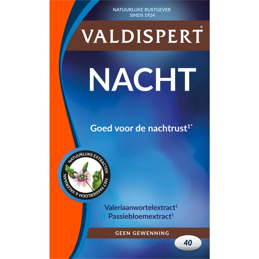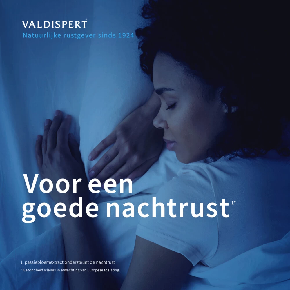 Valdispert NachtValdispert Nacht werkt rustgevend en ontspannend*. Valdispert Nachtis goed voor de nachtrust, geeft geen gewenning en vertoont geen bijwerkingen. Tevens kan Valdispert Nacht gebruikt worden gedurende langere perioden. Goed voor de nachtrust(1)*Ontspannend en rustgevend(2)*Op basis van passiebloem en valeriaanwortelextract.Geeft geen gewenningBevat geen conserveermiddelenVrij van geur- en smaakstoffen (1) passiebloem en (2) valeriaanwortelextract *Gezondheidsclaim in afw