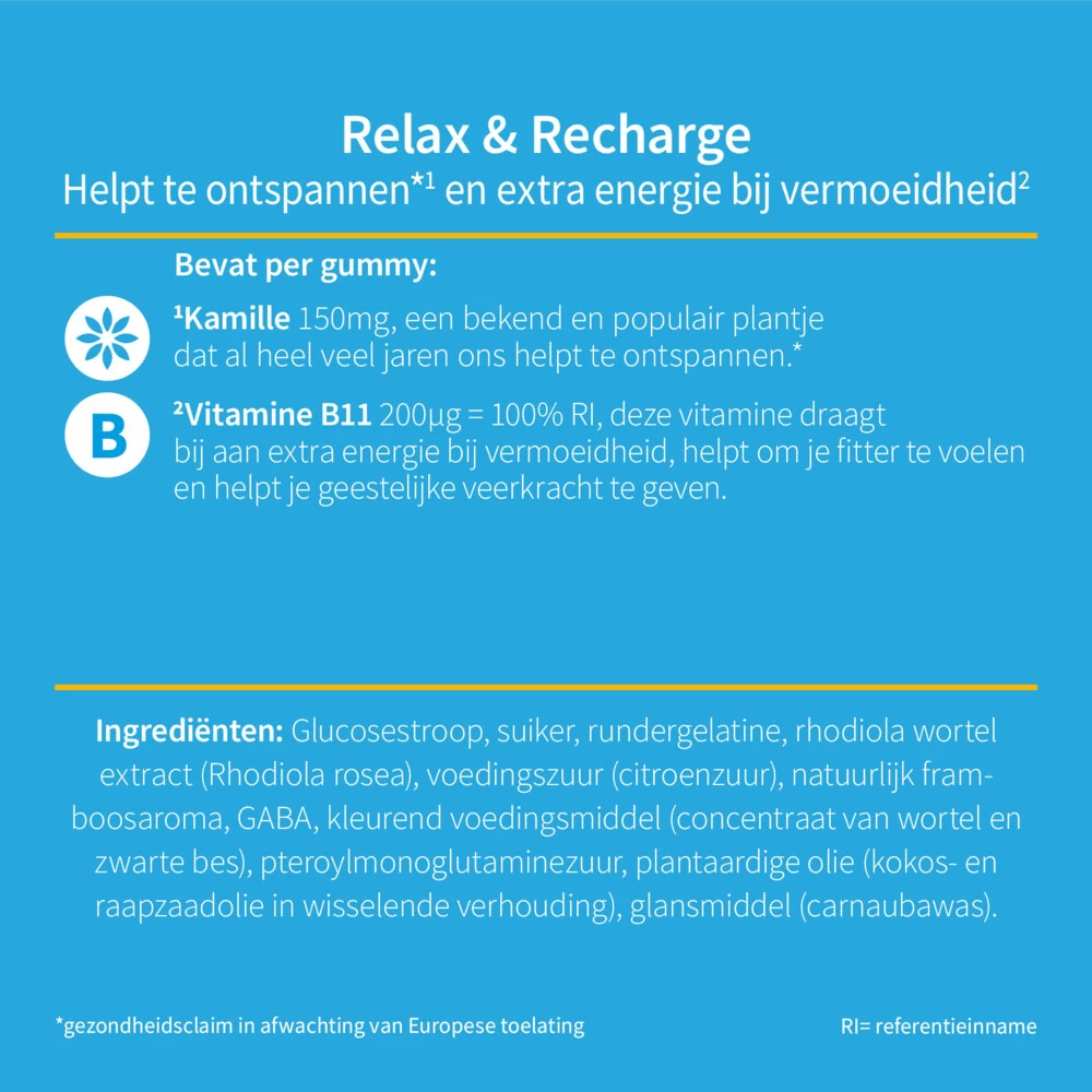 Valdispert Relax en RechargeValdispert Relax & Recharge gummies, helpen te ontspannen(1) en geven extra energie bij vermoeidheid(2). Valdispert Relax & Recharge bevat een unieke mix van kruiden en vitamine kamille, lashwagandha en vitamine B11. Deze gummies komen van pas tijdens drukke periodes waarbij er sprake is van meer vermoeidheid en stress. De zachte kauwbaregummies smaken aangenaam naar frambozen en kruiden..Helpt te ontspannen en geeft extra energie bij vermoeidheid*Geen kunstma