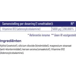 Vitakruid B12 Adenosyl 5000 Mcg smelttabletVitakruid B12 Adenosylcobalamine 5000 mcg is een actieve vorm van B12 en goed opneembaar. Het innemen van vitamine B12 via het mondslijmvlies (onder de tong) zorgt voor een optimale opname van deze vitamine. Vitamine B12 komt alleen voor in dierlijke producten, zoals melk, vlees en vis. Zowel bij mensen als dieren wordt vitamine B12 in het maag-darmstelsel door bacteriën aangemaakt; bij mensen wordt B12 echter niet door de rest van het lichaam opge
