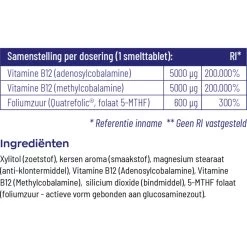 Vitakruid B12 Combi 10.000Vitakruid B12 Combi 10.000 met Folaat is een voedingssupplement met hoge doseringen B12 in de vorm van smelttabletten, die zorgen voor een snelle opname. B12 in de biologisch actieve vormen methylcobalamine en adenosylcobalamine wordt gecombineerd met de vierde generatie van folaat (Quatrefolic®). Deze vormen van vitamine B12 en folaat worden het beste door het lichaam opgenomen. Quatrefolic® (5-MTHF) heeft een uitstekende biologische beschikbaarheid in vergelij