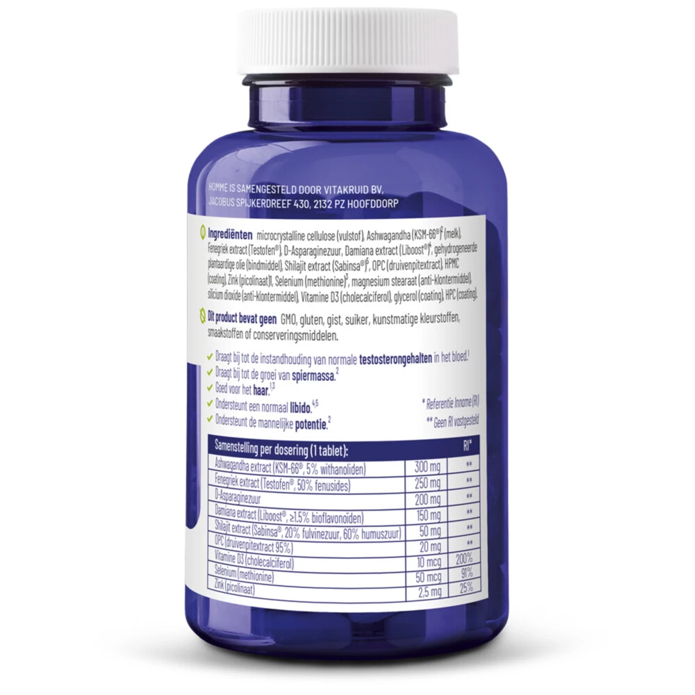 Vitakruid HommeVitakruid Homme Tabletten ondersteunt de mannelijke potentie*. De tabletten bevatten onder andere L. Ashwaganda, Vitamine D, Selenium en Zink. De toevoeging van Vitamine D helpt de normale spierwerking behouden**. En Zink draagt bij aan de vruchtbaarheid van de man; de productie van zaadcellen en is goed voor de kwaliteit van sperma*. Mede als dat Selenium bij draagt aan de beweeglijkheid van de zaadcellen*.Ondersteunt de mannelijke potentie*Met L. Ashwaganda en actieve withanolid