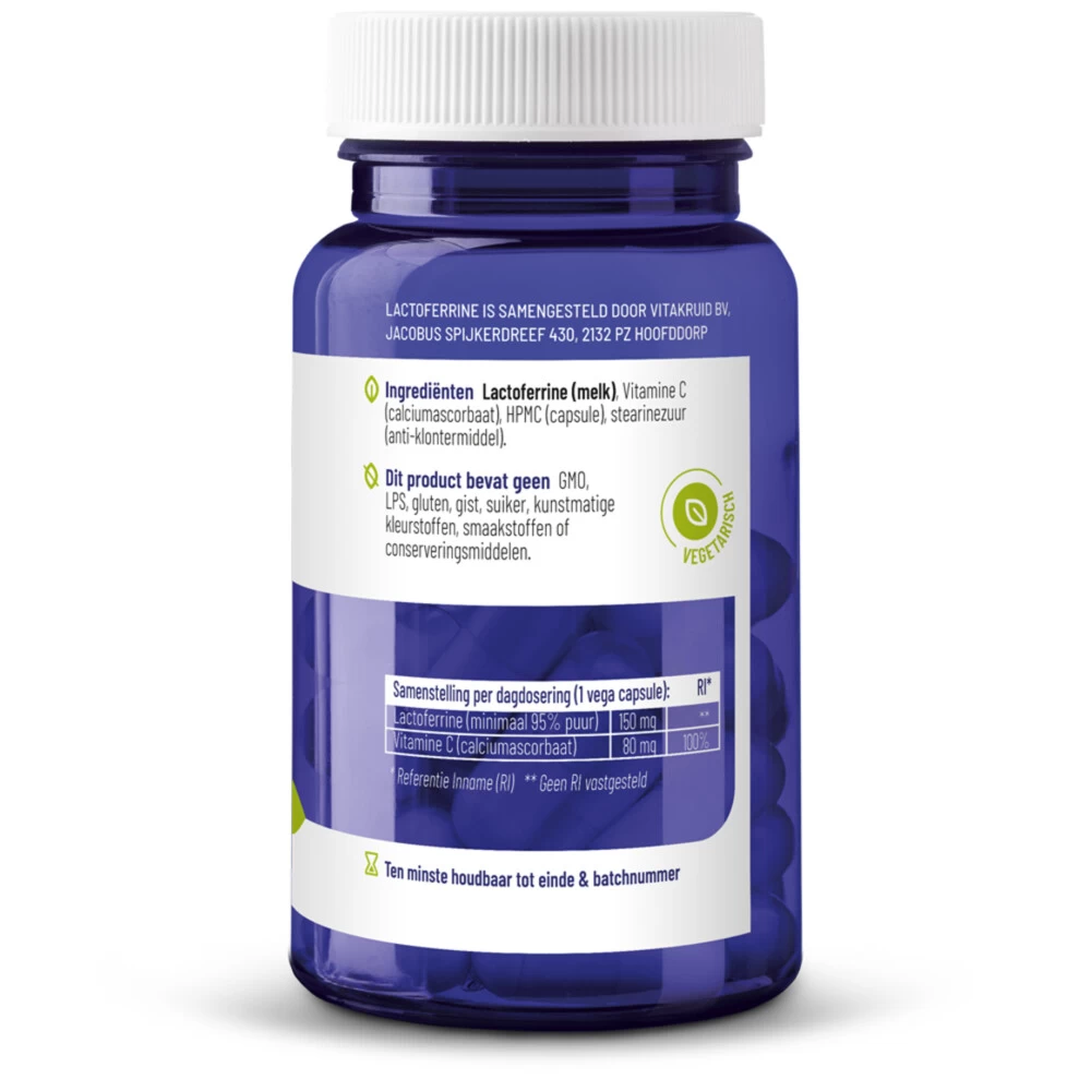 Vitakruid Lactoferrine 150mgLactoferrine is een eiwitsoort dat voornamelijk voorkomt in de moedermelk van zoogdieren (bij zowel mensen als dieren). De lactoferrine in Vitakruid wordt verkregen door middel van koude extractie. Hierbij extraheert men de werkzame stof zonder het te verwarmen, zodat de originele structuur behouden blijft. Eiwitten zijn immers hittegevoelig, waardoor extractie doormiddel van verhitting de werkzaamheid kan aantasten. Ondersteunt het immuunsysteem*Hoogste kwalite