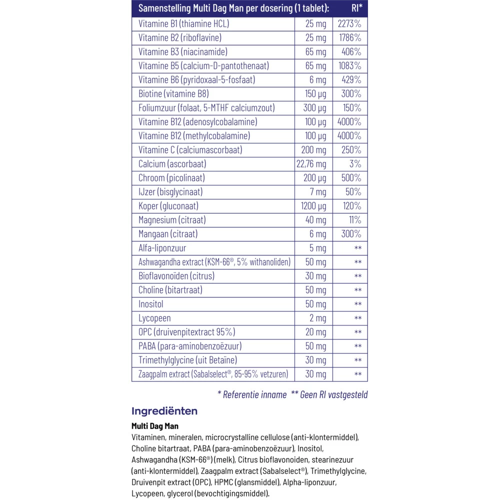Vitakruid Multi Dag & Nacht ManVitakruid Multi Dag & Nacht Man is een formule op basis van het bioritme. Overdag, als je actief bent krijg je met Vitakruid Multi Dag & Nacht Man andere voedingsstoffen dan op het moment dat je slaapt. De tabletten geven energie voor overdag, rust voor de nacht.Twee tabletten voor optimaal dag- en nachtritme (bioritme)Uitsluitend de best opneembare vormenEen compleet vitamine B-complex die bijdragen aan het energieniveauVrij van GMO, Gluten, gist, lact