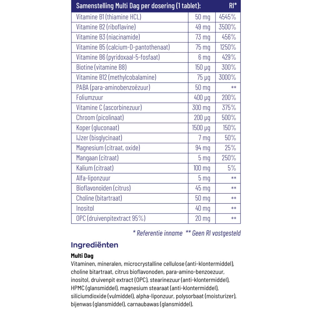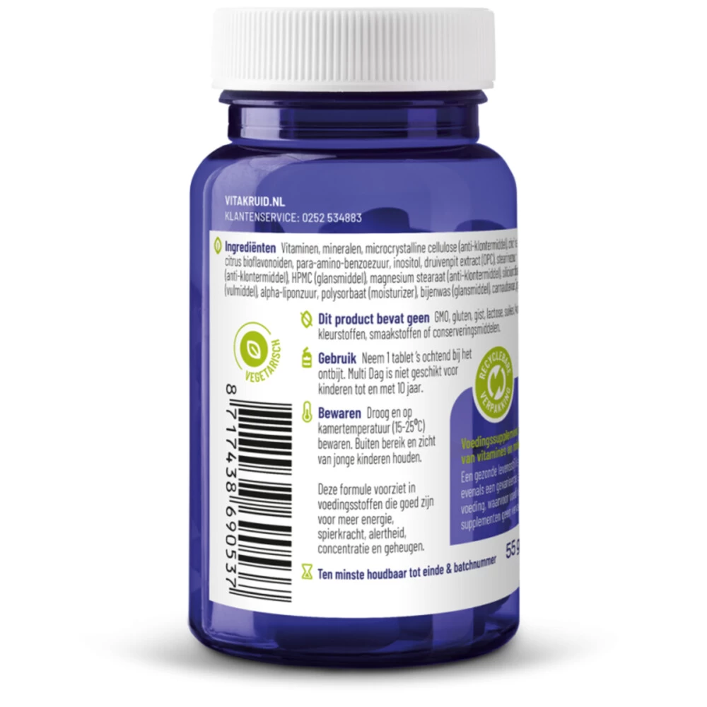 Vitakruid Multi DagVitakruid Multi Dag is een hoogwaardige multi met actief B-Complex voor energie. De hoge dosering vitamine B12 in de Multi Dag activeert de natuurlijke energie in het lichaam en daarnaast is de vitamine C goed voor het concentratievermogen en draagt de toegevoegde calcium bij aan de zenuwfunctie*.Uitgekiende formule voor de dagDe veiligste vorm van Vitamine B6 (P-5-P).Bevat een actief B-complexToevoeging van OPC maakt andere nutriënten effectieverGlutenvrij en lactosevrij