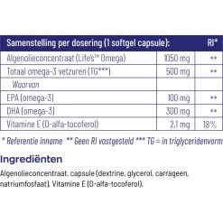 Vitakruid Omega 3 1000 Tryglyceriden 300DHA 100EPAVitakruid Vegan Omega-3 1000 TG Capsules is een plantaardige omega-3 bron voor vegetariërs en veganisten. DHA en EPA zijn ondersteunen het hart*. Daarnaast helpt DHA scherp te blijven zien en is een belangrijke bouwsteen voor de hersenen*. Algenolie bevat geen verontreinigingen, zoals in visolie kunnen voorkomen. Voor de productie van de meeste visoliesoorten zijn grote hoeveelheden vis nodig, waardoor oceanen uitputten. De roep om een duurz