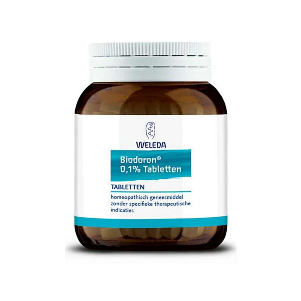 Weleda Biodoron tabletten 0,1%Biodoron tabletten 0,1% is een homeopathisch geneesmiddel. Door de huidige wetgeving is het niet mogelijk om op de verpakking te vermelden waar dit product voor is (indicatie) en meer informatie te geven. Plein.nl mag deze informatie ook niet op de site zetten. Mocht je algemene informatie willen over dit product stuur dan een mail naar onze drogist dan kan zij je persoonlijk de gevraagde informatie geven.